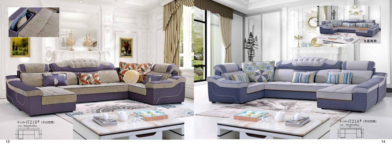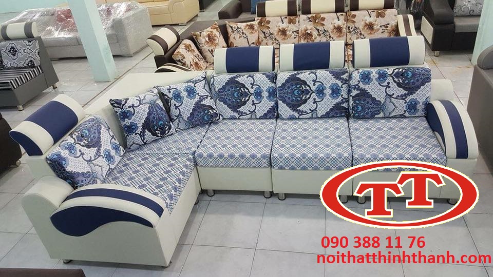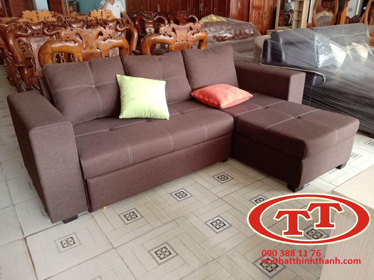 - Bộ ghế sofa chất liệu vải, thiết kế dạng góc chữ L nhưng được thiết kế đa năng, kết hợp các phụ kiện và bộ phận khác nhau với phần góc có thể được nâng lên, phía dưới là không gian có thể đựng đồ như gối, chăn,…còn đối với phần chiều dài của ghế thì có thể kéo thành một chiếc giường vô cùng tiện dụng.